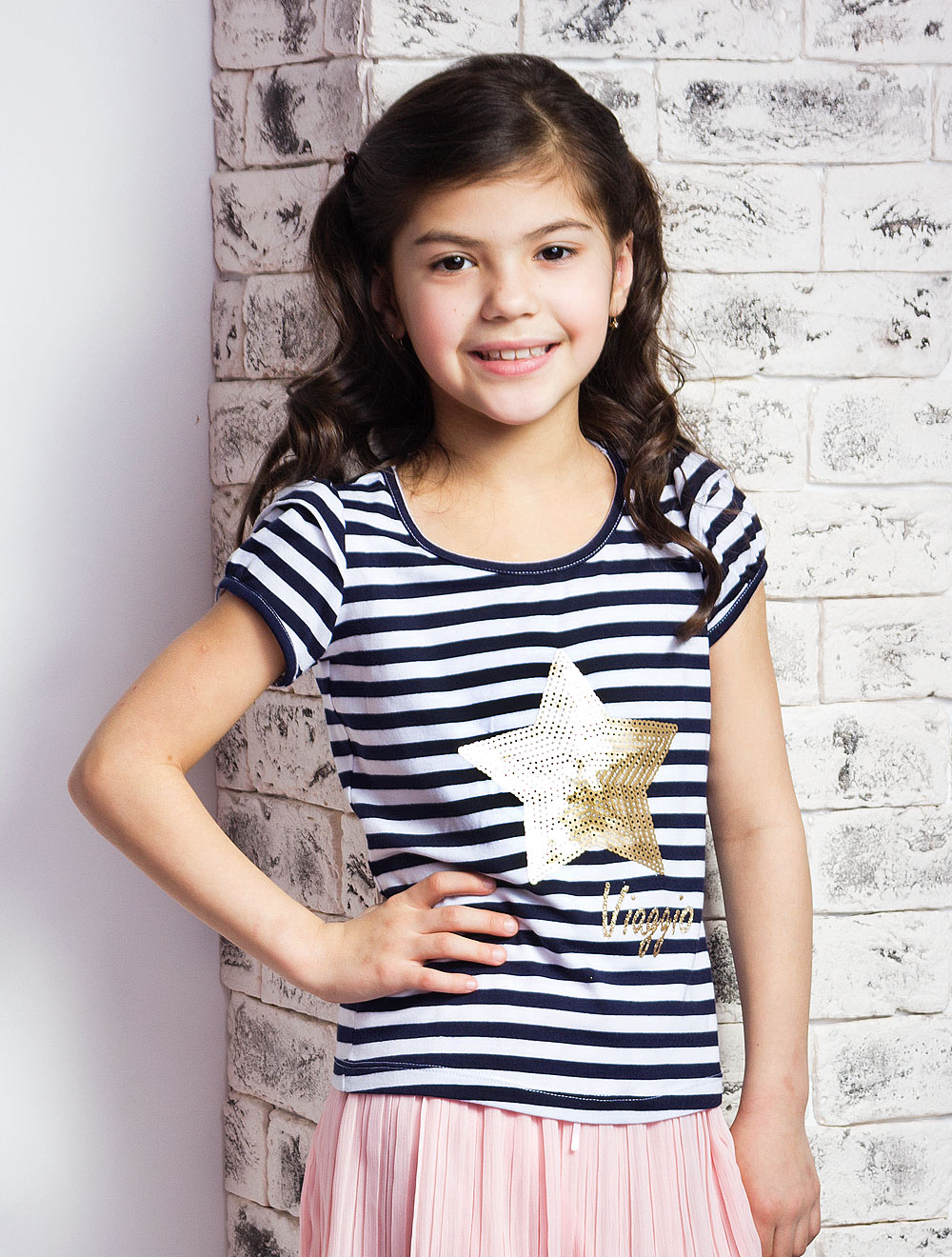 Описание: Футболка, декорированная пайетками и воланами на плечах.