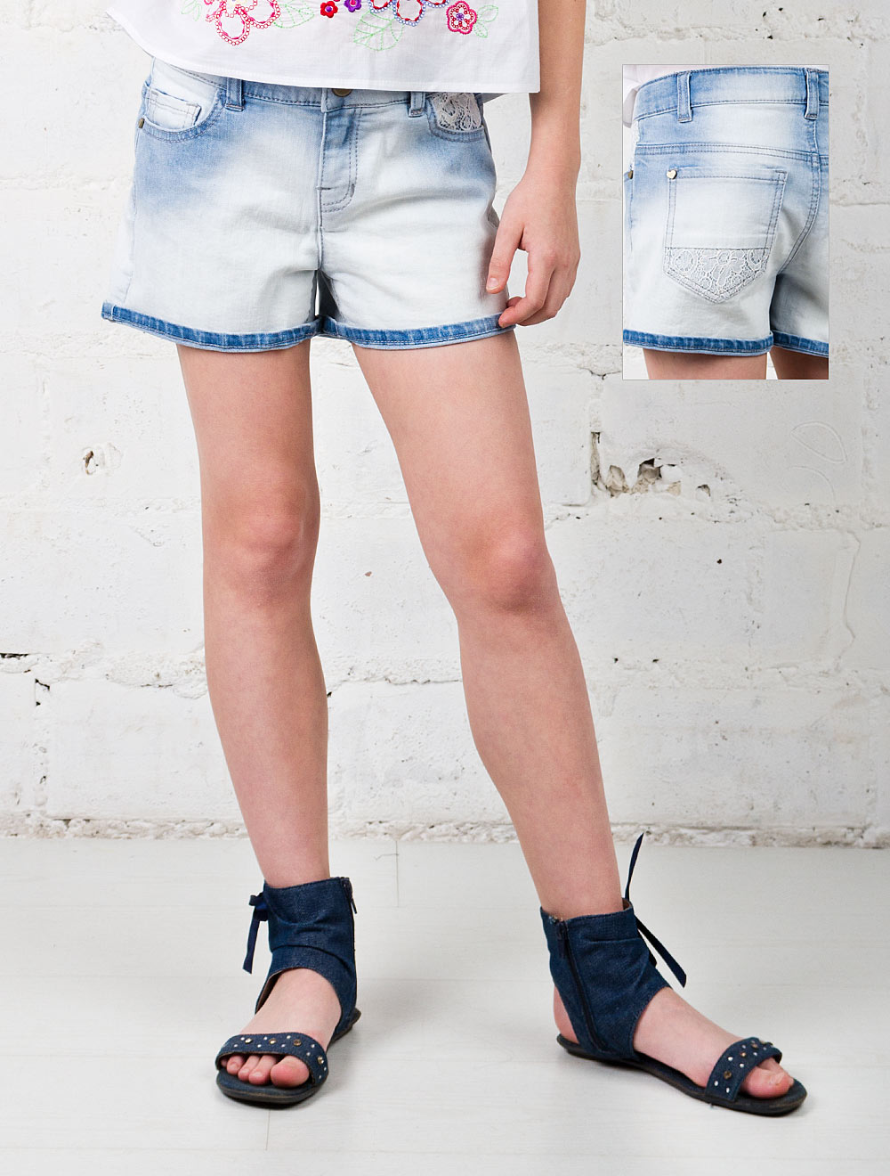 Описание: Джинсовые шорты, декорированные кружевом.