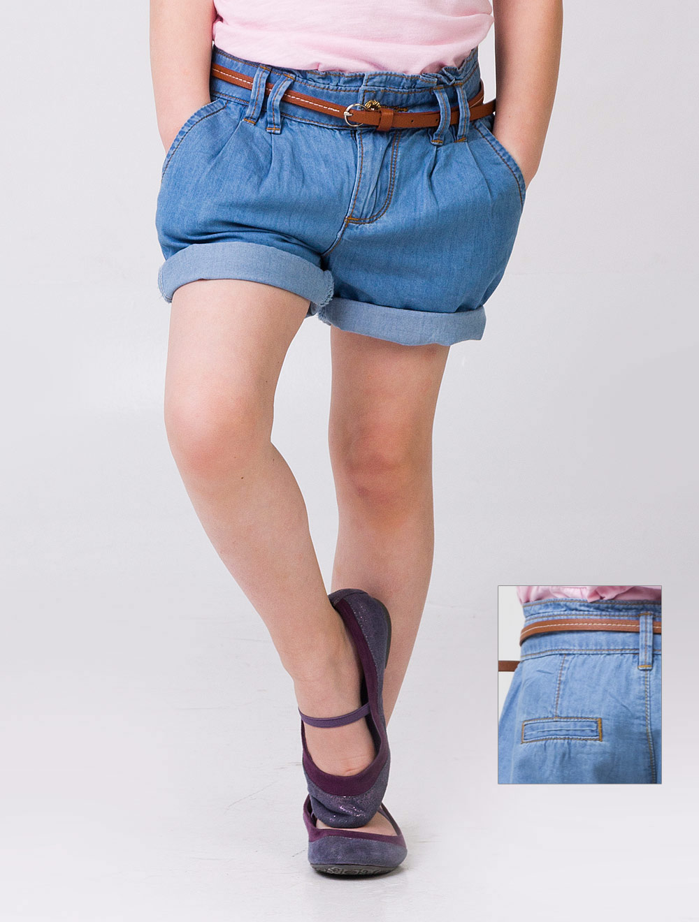 Описание: Шорты из тонкой джинсовой ткани с поясом из искусственной кожи.