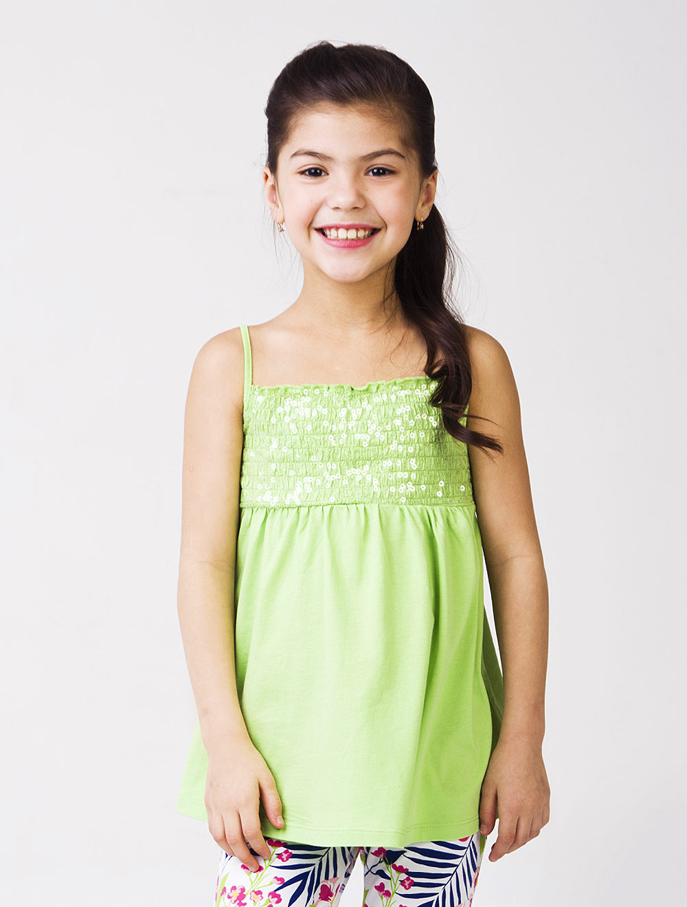 Описание: верхняя часть собрана на эластичные нити и полностью расшита прозрачными пайетками, регуляторы бретелей