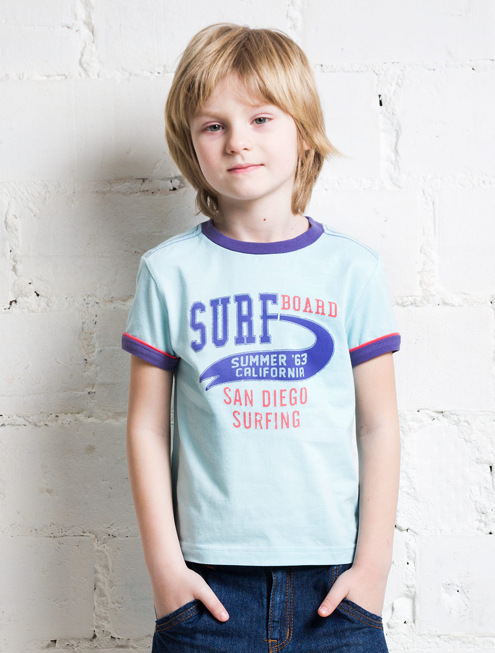 Описание: Футболка с принтом на тему серфинга. Контрастная окантовка горловины и низа рукавов с коралловым кантом.