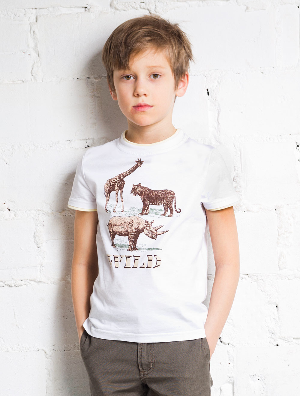 Описание: Футболка из хлопкового трикотажа, декорированная принтом. Окантовка горловины и низ рукава с отделкой контрастного цвета.