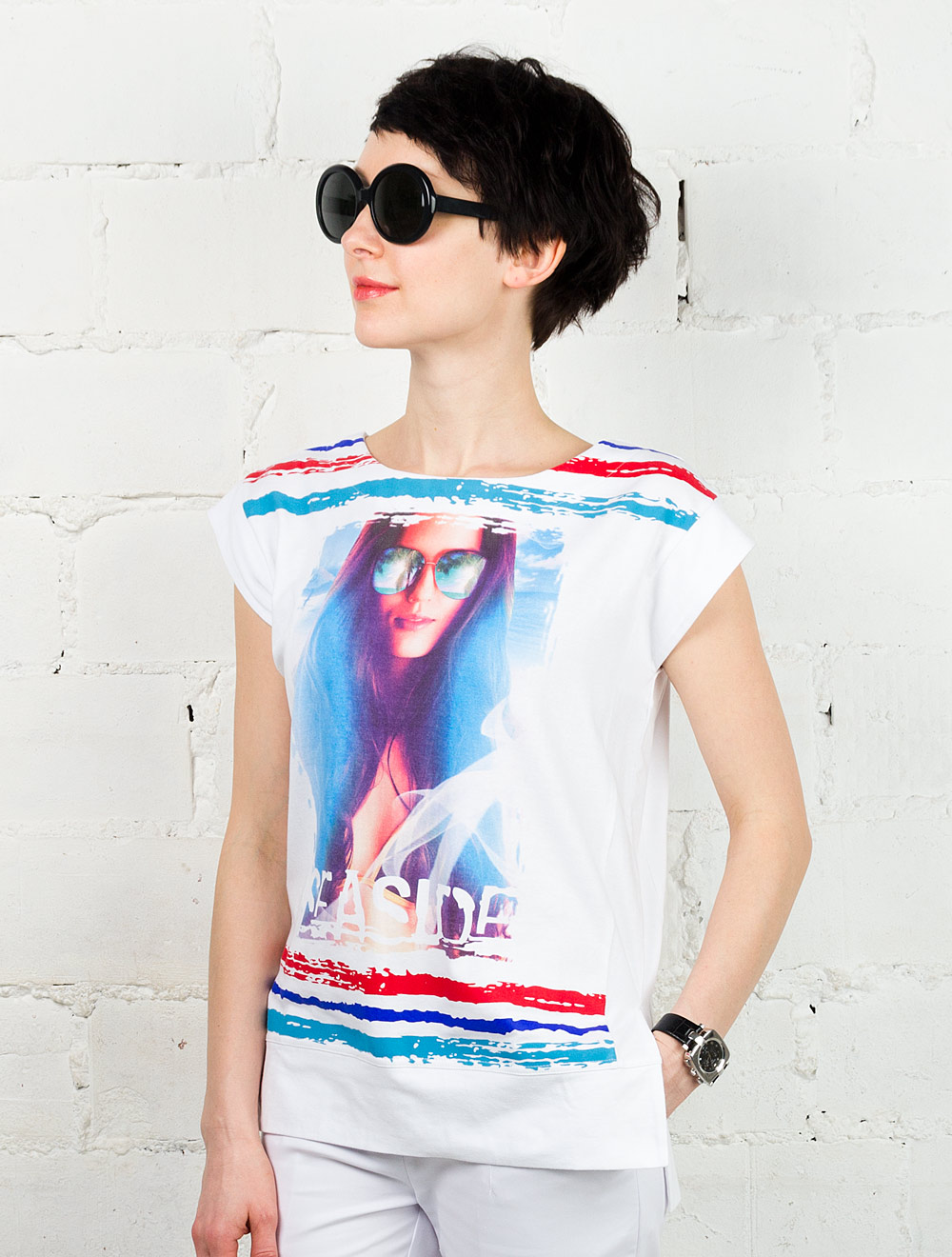 Описание: Изделие свободного силуэта, крой со спущенным плечом. Перед украшен принтом.