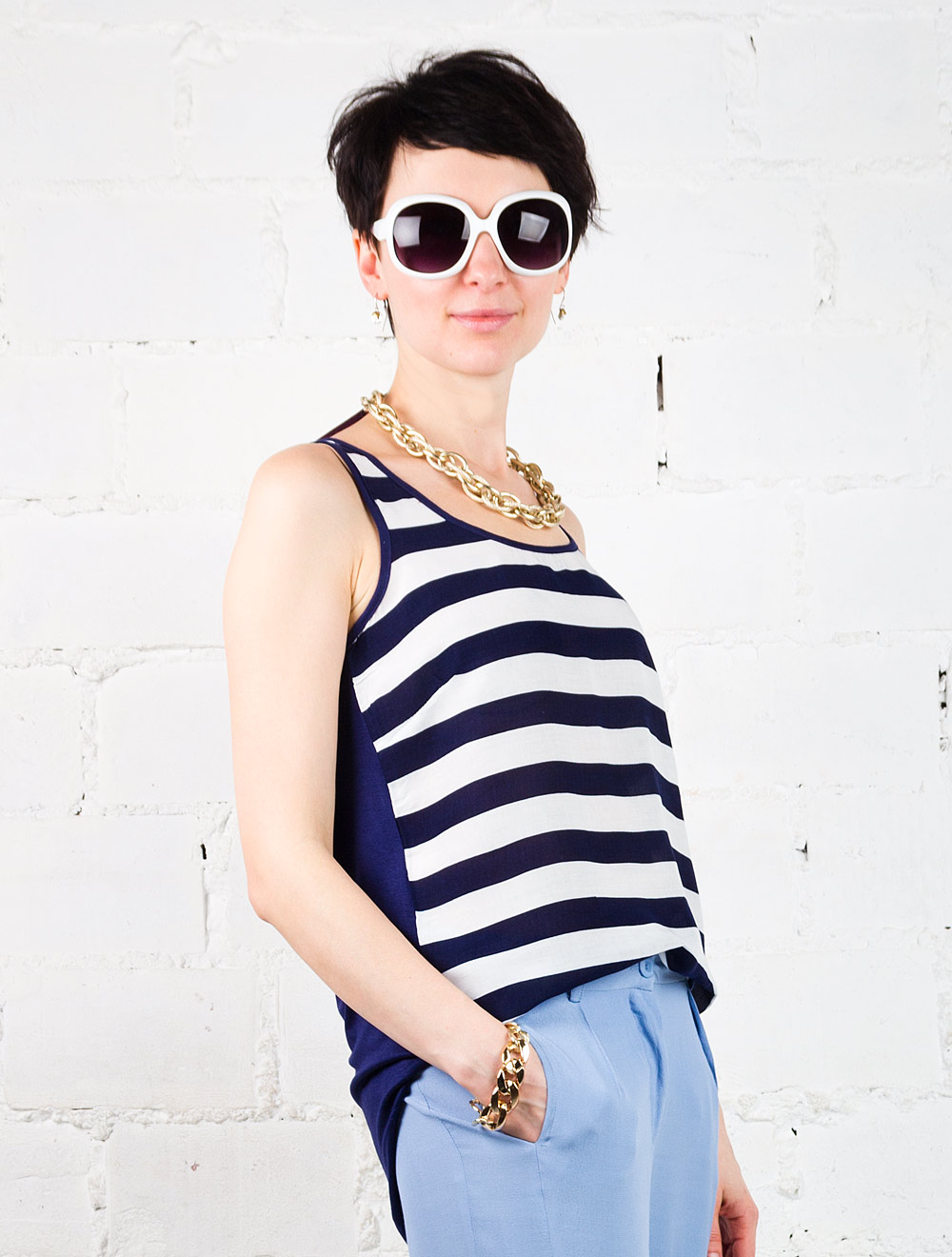 Описание: Перед выполнен из тончайшего вискозного полотна "вуаль" в полоску, окантовки и спинка из вискозного трикотажа. Спинка удлиненная.