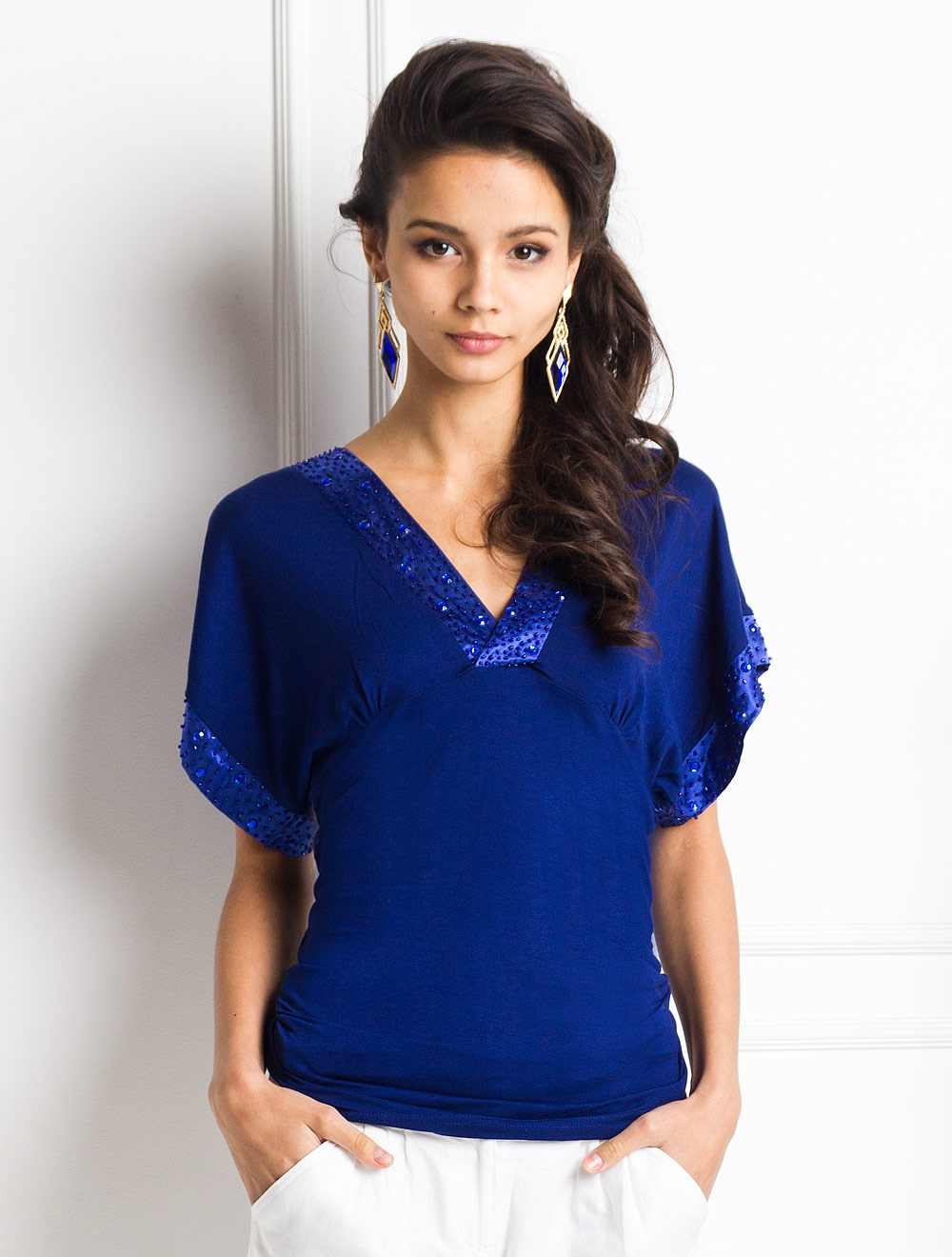 Описание: Тонкий вискозный трикотаж. Изделие приталенное, отрезное под грудью. Проймы-кимоно и горловина оформлены атласными окантовками. Эти окантовки вручную расшиты бисером и пайетками.