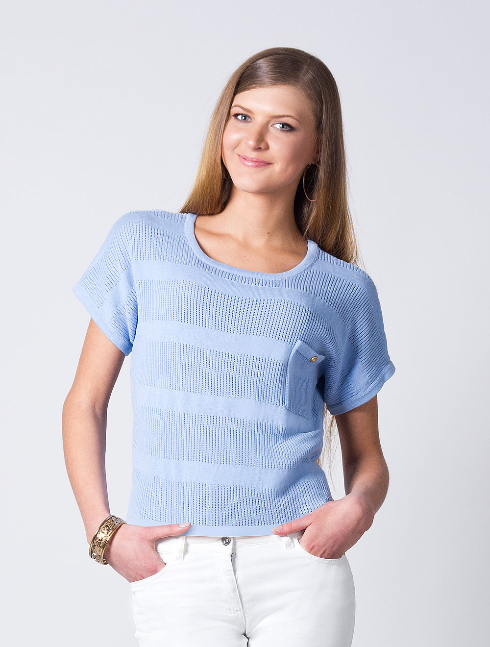 Описание: Ажурная хлопковая вязка с эффектом полос за счет смены фактуры, карман с золотистой пуговицей на груди. Излелие укорочено спереди.