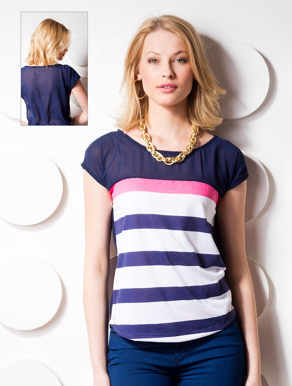 Описание: Передняя часть выполнена из трикотажа с ярко-розовой и синей полосой, плечи, рукава и спинка из полупрозрачного шифона.