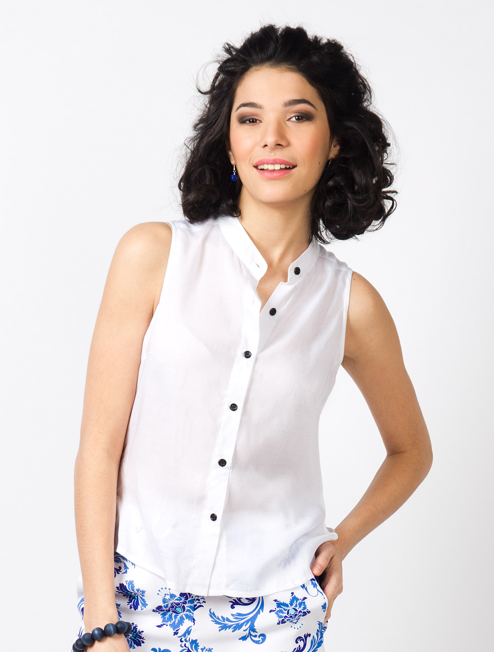 Описание: Тончайшая вискоза "вуаль". Спокойный классический силуэт блузы со стойкой спереди - провокационно выглядит сзади благодаря открытой спинке с драпировкой.