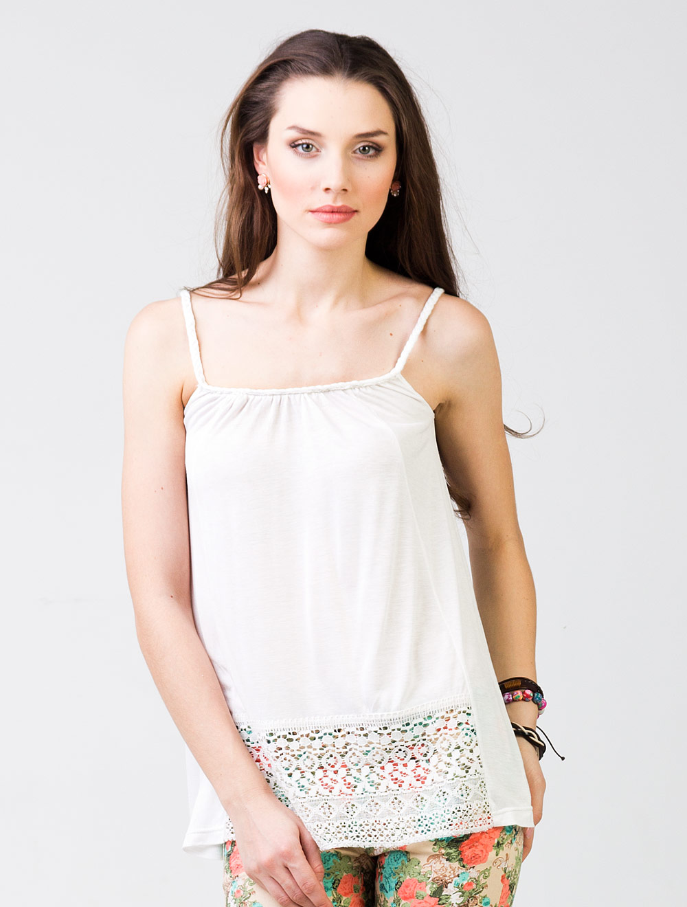 Описание: Тонкое вискозное полотно. Перед украшен вставкой из матового кружева. Горловина и бретели выполнены из плетеных косичек. Верхняя линия топа обработана с открытым срезом, на который закреплена декоративная косичка.