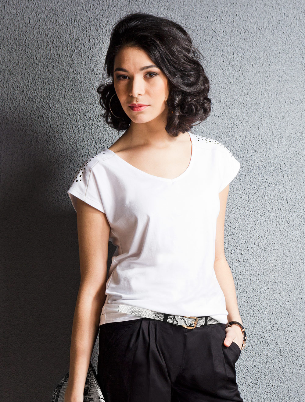 Описание: Эластичное хлопковое полотно, свободный силуэт со спущеным плечом. Плечи оформлены в виде кокетки с декорацией из клеевых заклепок черного цвета с золотистым ободком. Линия ложной кокетки оформлена специфической строчкой золотистого люрекса.