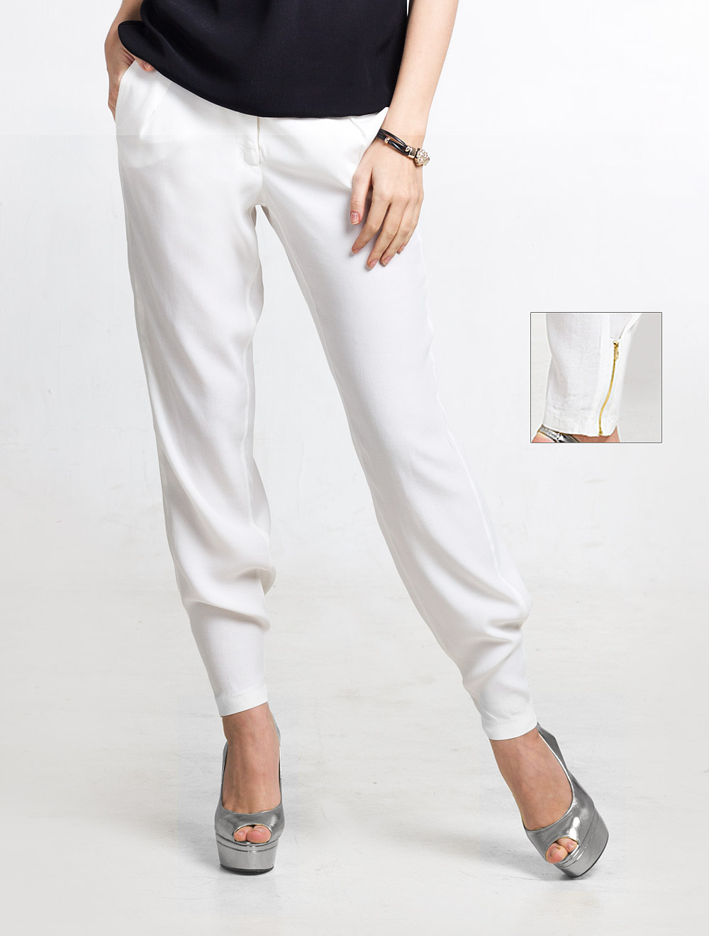 Описание: Фактурная вискоза. Сбоку внизу вставлены золотистые металлические молнии, благодаря которым можно менять силуэт изделия от свободного до "бананов".