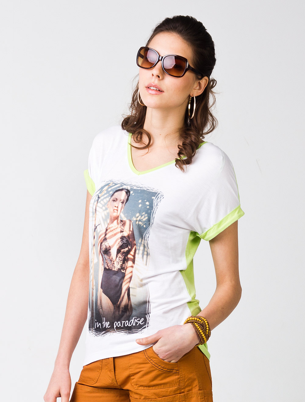 Описание: Изделие из двух оттенков тонкого вискозного трикотажа. Спереди на белом фоне фото-принт девушка "In the paradise", рукава цельнокройные с манжетами. Манжеты и спинка ярко-зеленого цвета.