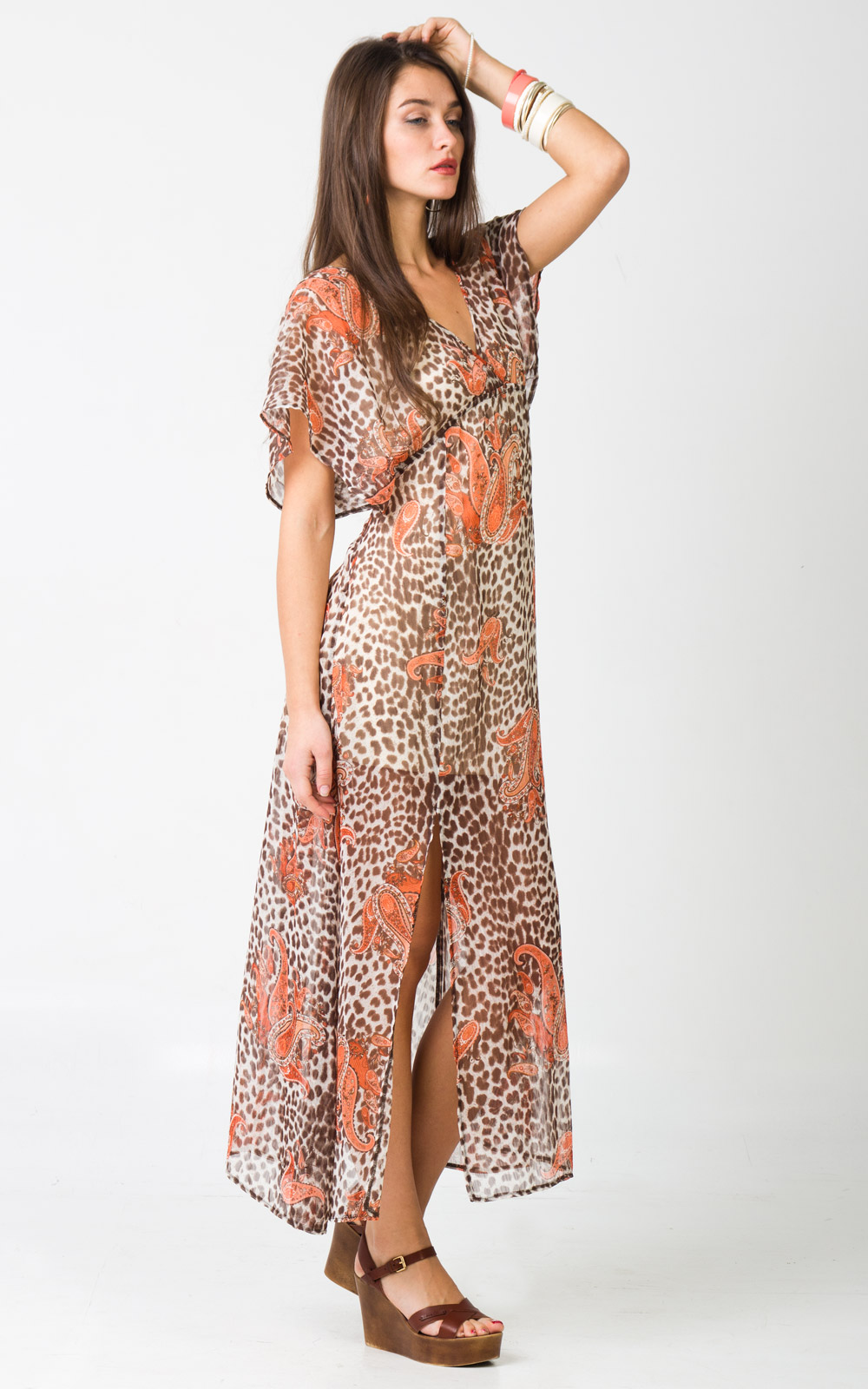 Описание: Тонкий шифон-жатка с принтом под шкуру леопарда и элементами "пейсли" кораллового цвета. Линия талии завышена под грудью. Нижняя часть без сборки под грудью, цельнокройные рукава-кимоно. К платью прилагается трикотажная бежевая сорочка в качестве подкладки.