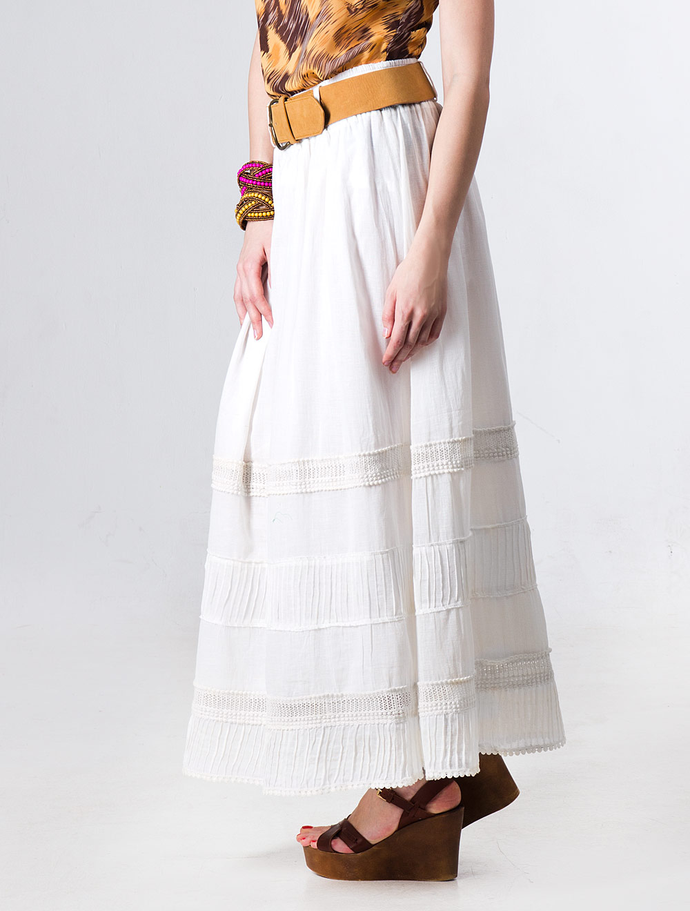 Описание: Тончайшее хлопковое полотно в основе и еще более тонкая подкладка. Юбка украшена кружевом из хлопка. Пояс выполнен из ряда эластичных нитей. В стоимость входит ремень из иск.замши.