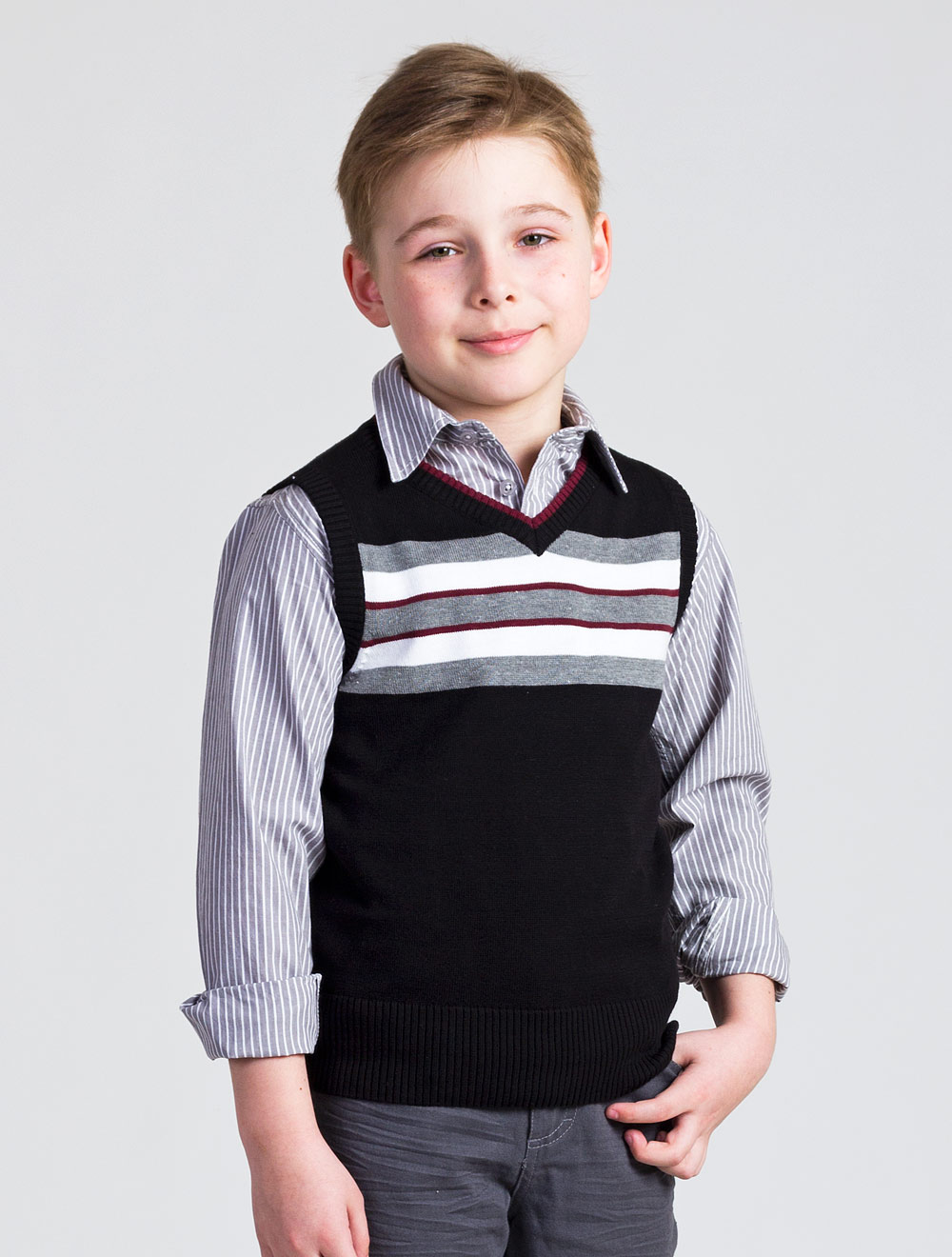 Описание: Изделие выполнено вязкой средней плотности.На груди вывязаны контрастные полосы.