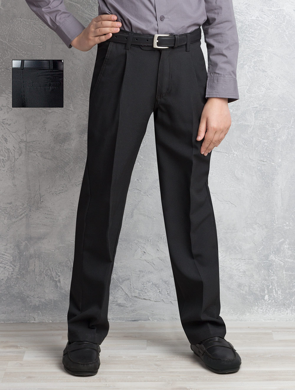 Описание: классическая форма брюк, выполнены из ткани в мелкую, спокойную полоску