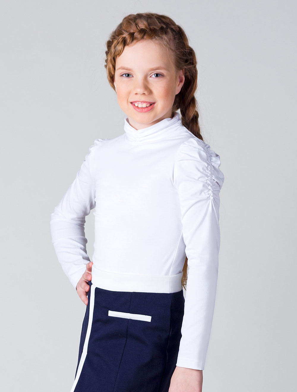 Описание: Изделие из тонкого трикотажа. Верхнюю часть рукава и ворот украшает декоративная сборка. Удлиненная модель.
