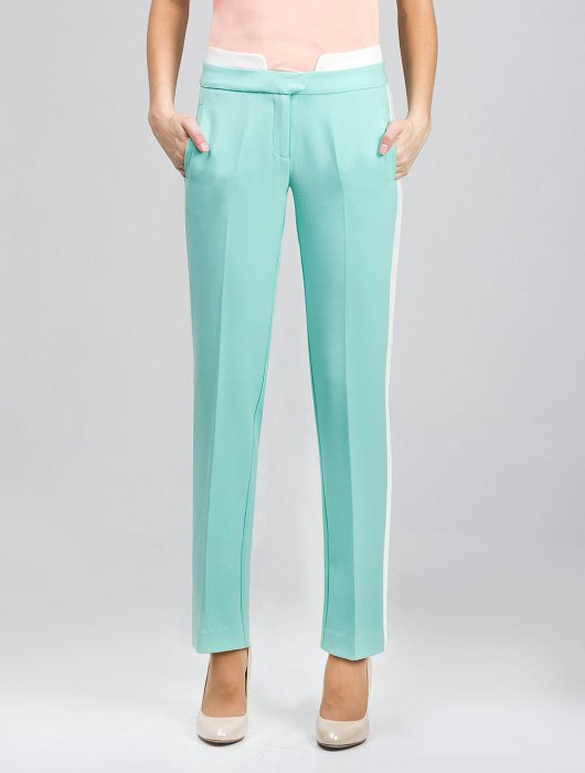 Описание: Выполнены и формоустойчивой и эластичной ткани средней плотности. Пояс украшен контрастными белым вставками, что эффектно выглядит при носке верхнего топа в заправку, боковые швы украшены белыми лампасами шириной 2,5 см.