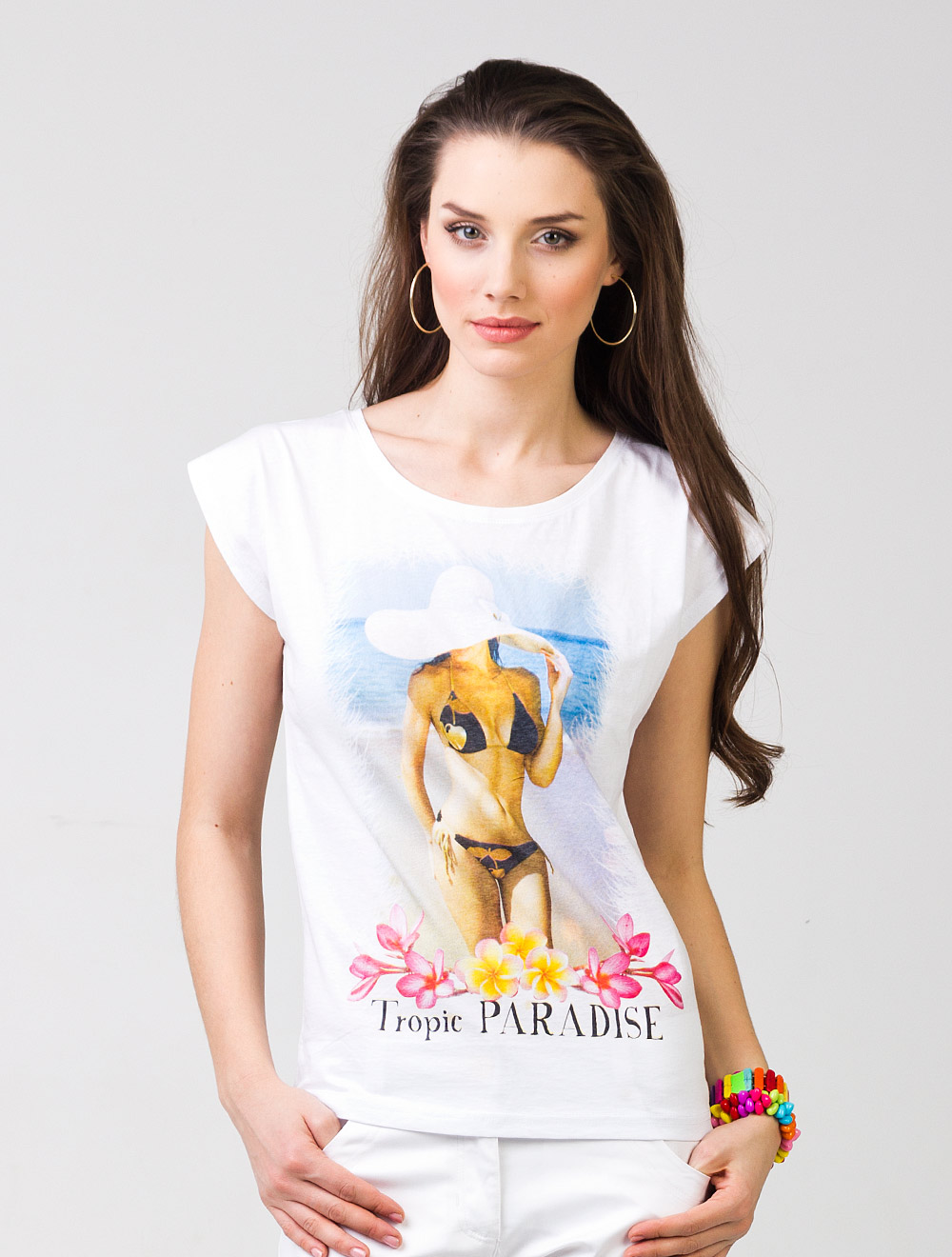Описание: Хлопковый трикотаж средней плотности. Свободный силуэт со спущенным плечом. Перед украшен тропическим принтом.