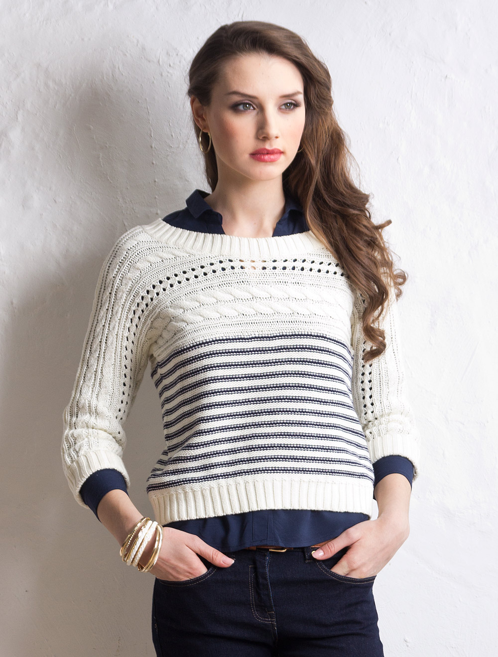 Описание: Крупная и несколько свободная вязка из хлопковой пряжи. Цельнокроеный рукав длиной 3/4. Полосы выглядят особенно эффектно за счет вязки изнанкой на лицевую сторону.