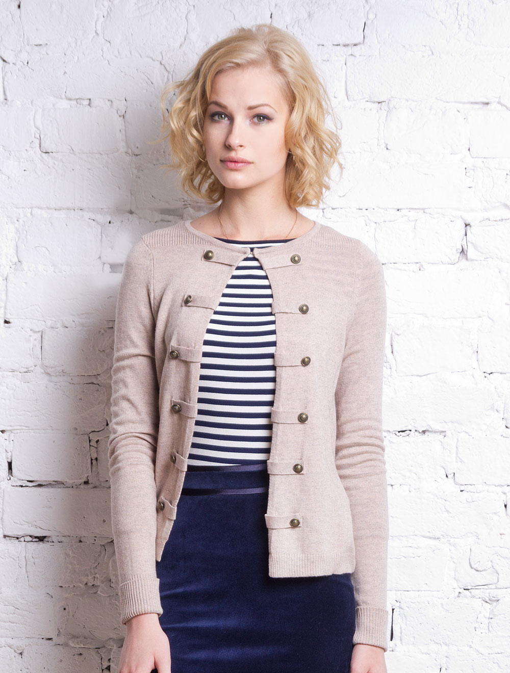 Описание: Тонкая вискозная вязка из бежевой пряжи с эффектом меланж. Застежка горловины на крючок. Жакет с элементами стиля милитари: борта и манжеты украшены патами с узорными металлическими пуговицами цвета латунь.