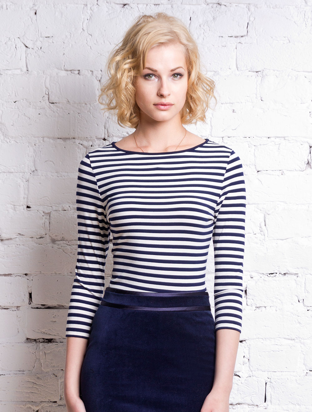 Описание: Эластичная трикотажная вискоза. Приталенный силуэт, вырез горловины по форме "лодочка" с синей окантовкой. Рукав 3/4.