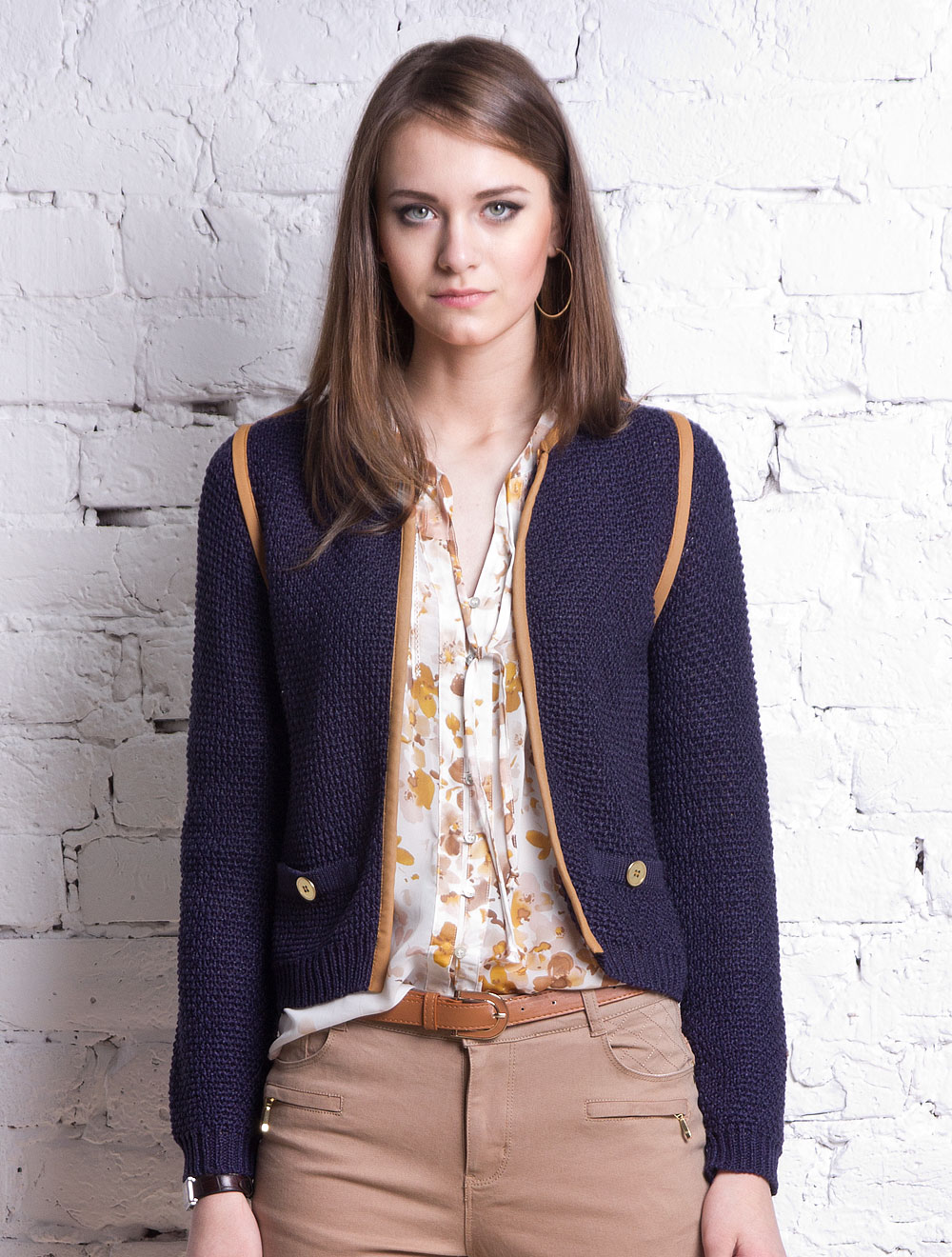 Описание: Крупная фактурная вязка, имитирующая стиль тканей "Шанель". Окантовки пройм, горловины, плечевых швов и бортов выполнены из неэластичного полиэстера контрастного цвета - обеспечивают жакету формоустойчивость.