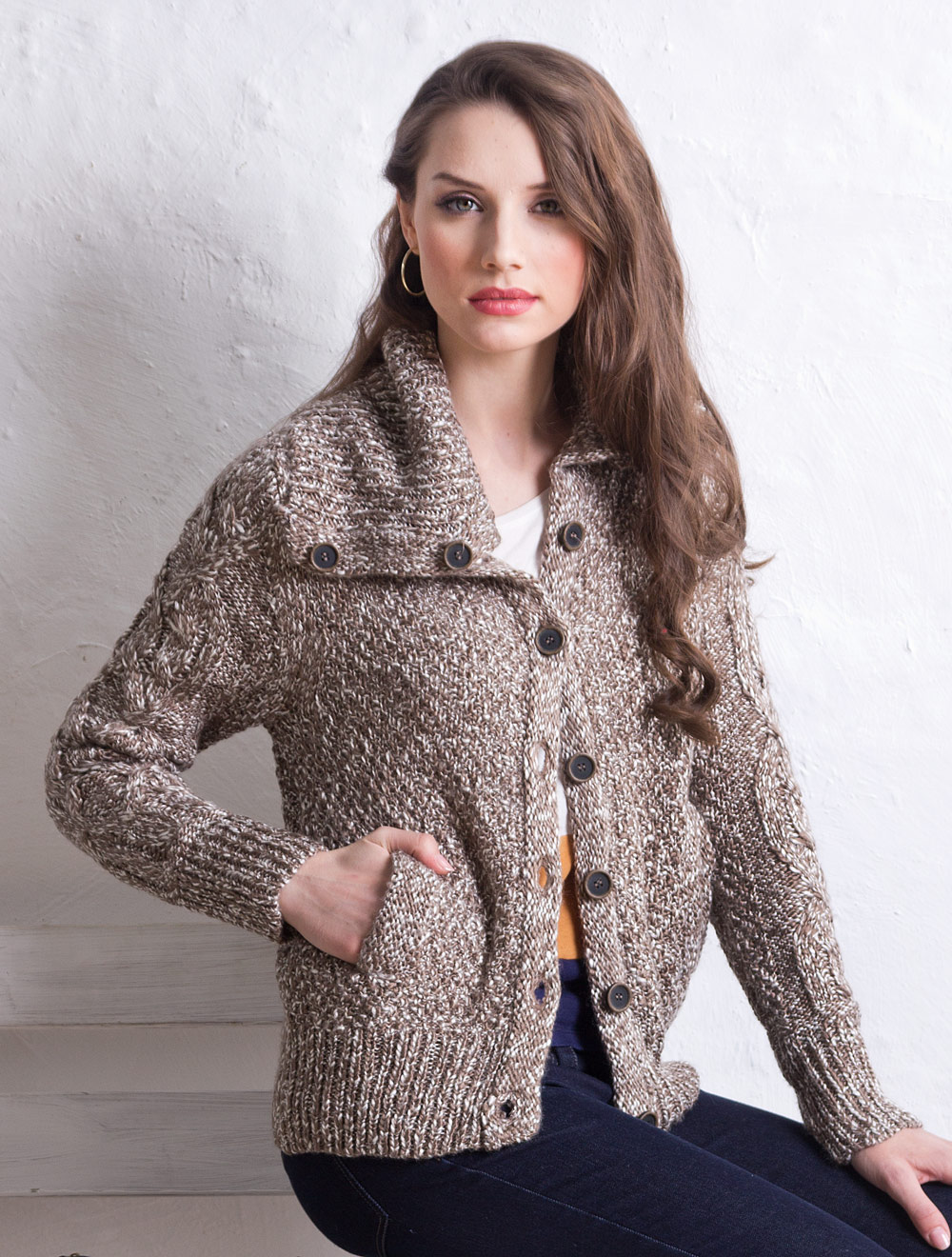 Описание: Крупная вязка из мягкой и теплой пряжи меланж. Рукава вывязаны с узором косы. Застежка на крупные коричневые пуговицы. Широкий воротник связан резинкой застегивается до верху. Имеются карманы на листочках.
