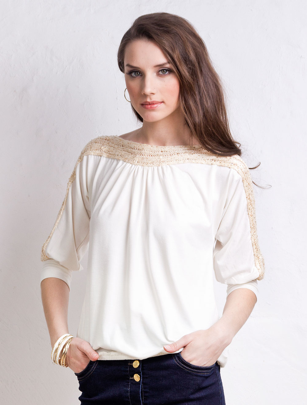 Описание: Трикотажное хорошо драпируемое полотно. Линия горловины и плеч выполнена из пряжи с мохером и вплетенными в нее мелкими золотистыми пайетками. Рукав цельнокроеный "летучая мышь" на широком манжете. Низ изделия на резинке.