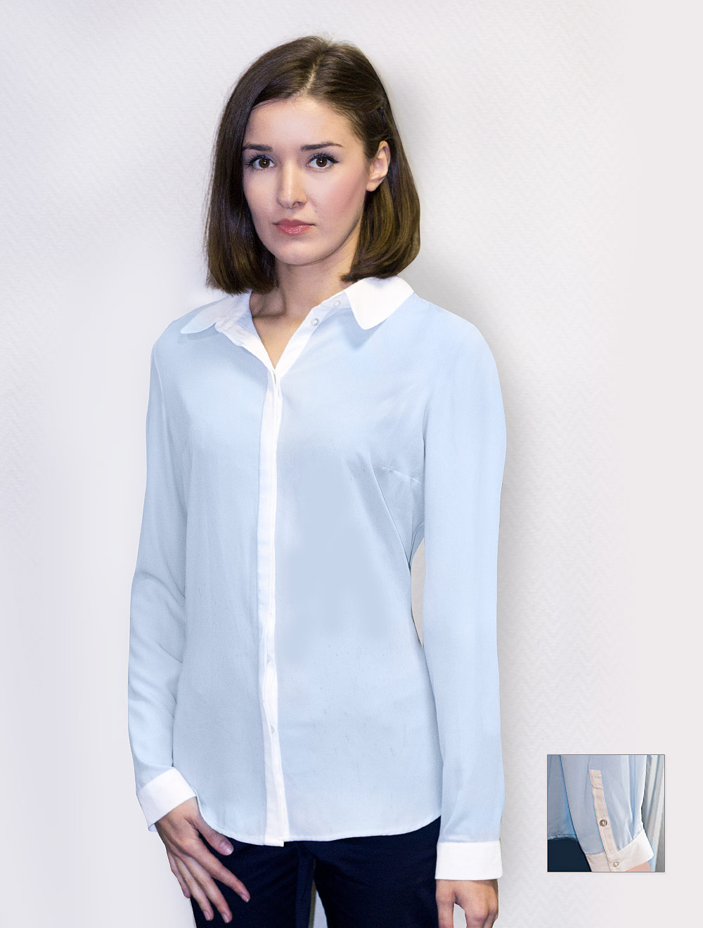 Описание: Блузка классического покроя из плотного мягкого , драпирующегося полиэстер. Передняя планка, воротник, манжеты и планка рукава выполнены из отделочной ткани.