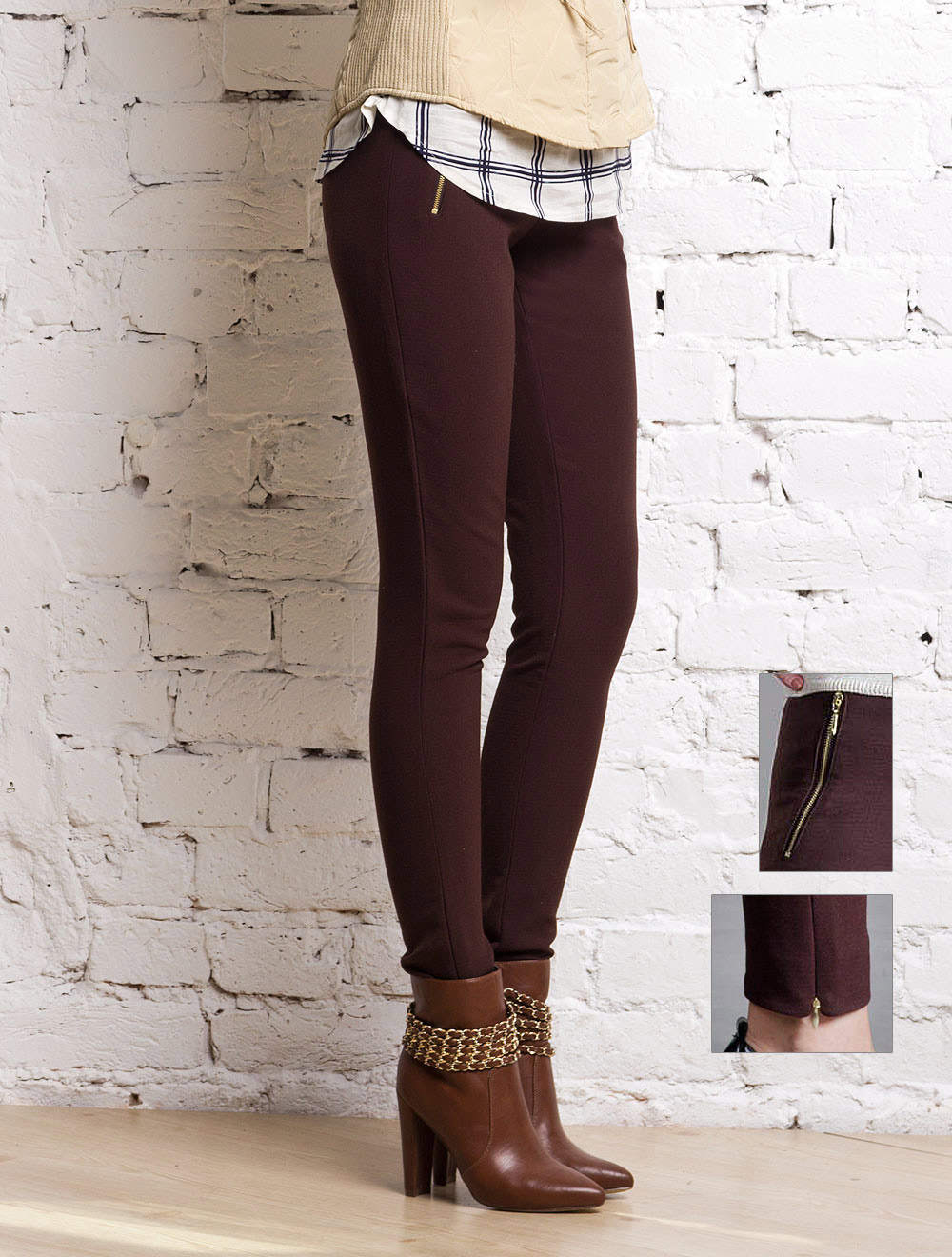 Описание: Брюки выполнены из плотной эластичной классической ткани. Имитация передних карманов украшена металлическими молниями золотистого цвета. Брюки заужены к низу, низ на потайных молниях.