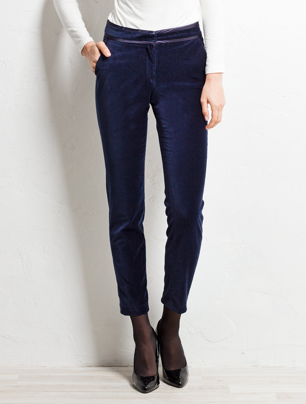 Описание: Выполнены из плотного эластичного хлопкового бархата. Пояс украшен атласными вставками. Брюки заужены книзу. Низ брючин на потайных молниях.