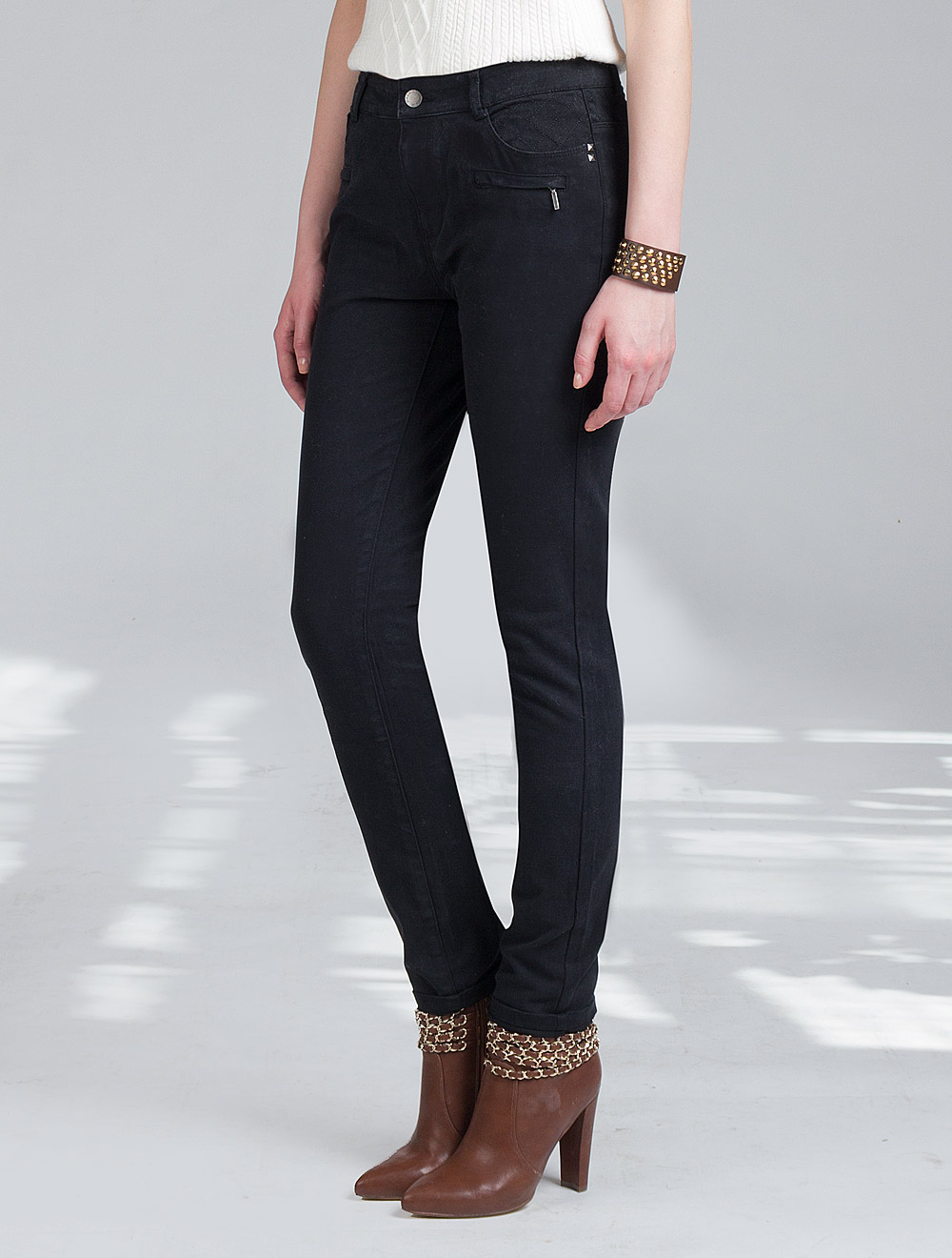 Описание: Брюки выполнены из плотного эластичного хлопка с эффектом бархатного ворса. Эффект придает толстая отстрочка атласными нитками. Кокетка сверху украшена трендовой отстрочкой в ромбик. Фурнитура темно-серебристого цвета.