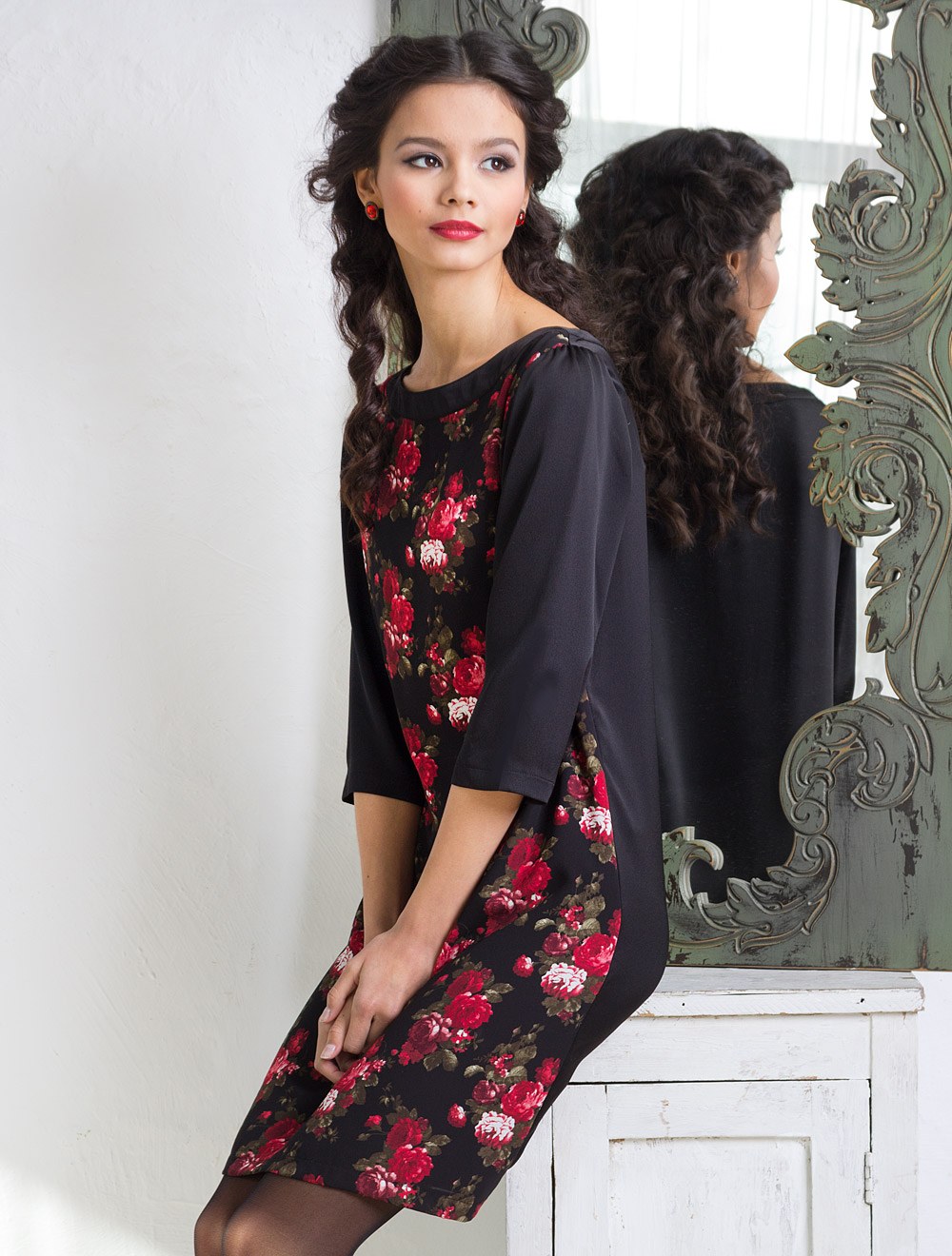Описание: Передняя часть платья из матового полиэстера на подкладке, задняя полуматовый эластичный атлас. Рукав 3/4 со сборкой по окату. Прямой силуэт. Ворот спереди оформлен широкой обтачкой черного цвета. В больших размерах изделие по колено.