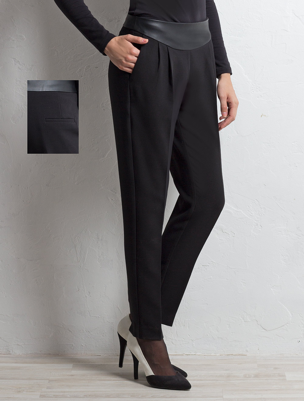 Описание: Брюки из плотной формоустойчивой классической ткани. Свободные сверху, благодаря защипам. Утюжка с классической стрелкой. Застежка на молнии сбоку. Пояс выполнен в виде кокетки из иск. кожи.
