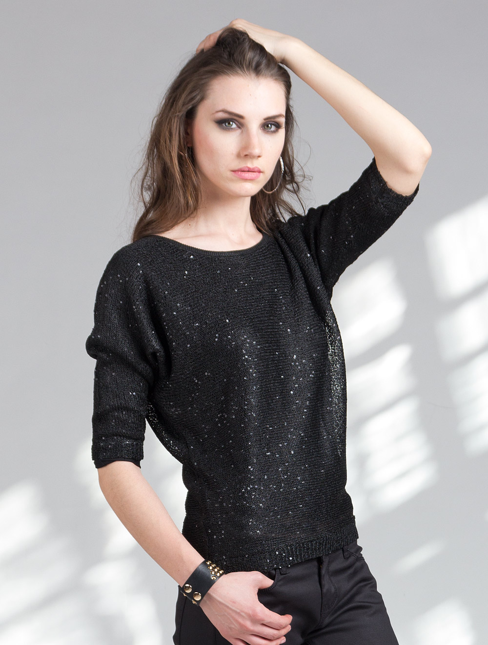 Описание: Джемпер из пряжи с вплетенными пайетками, которые создают эффект мерцания. Сзади джемпер украшен вырезом-каплей.