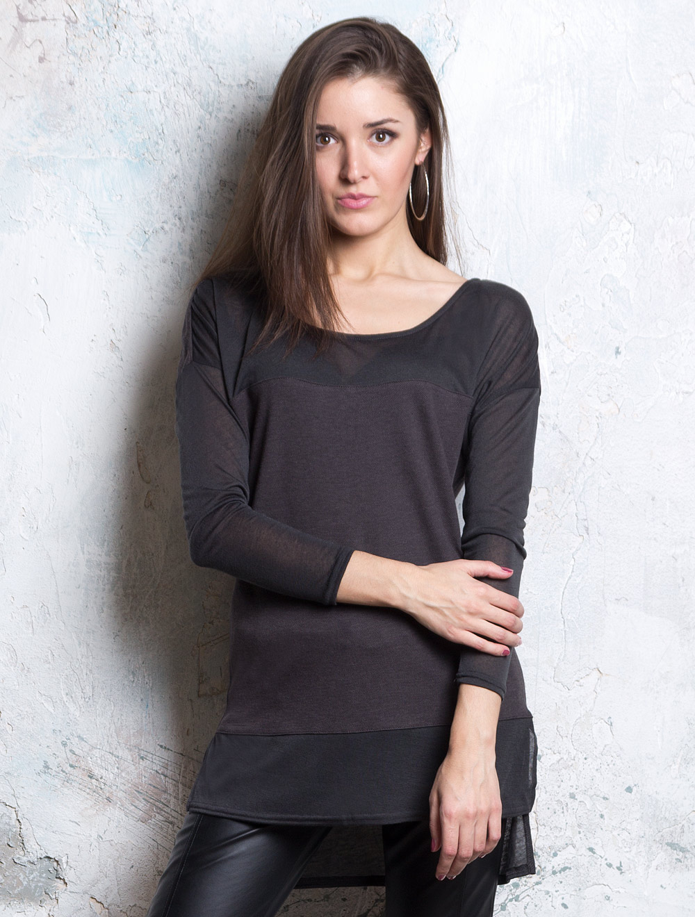 Описание: Перед и спинка из плотного фактурного трикотажа, рукава, кокетка и низ из тонкого полупрозрачного трикотажа, горловина сзади украшена позолоченной цепочкой