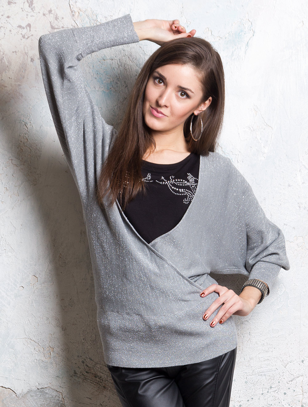 Описание: Джемпер с эффектом запаха. В пряже присутствует люрекс, что создает эффект мерцания.