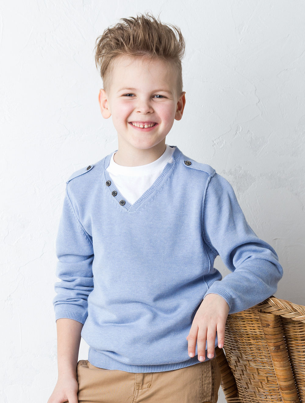 Описание: Вязаный джемпер из мягкого хлопка. Горловина декорирована пуговицами.