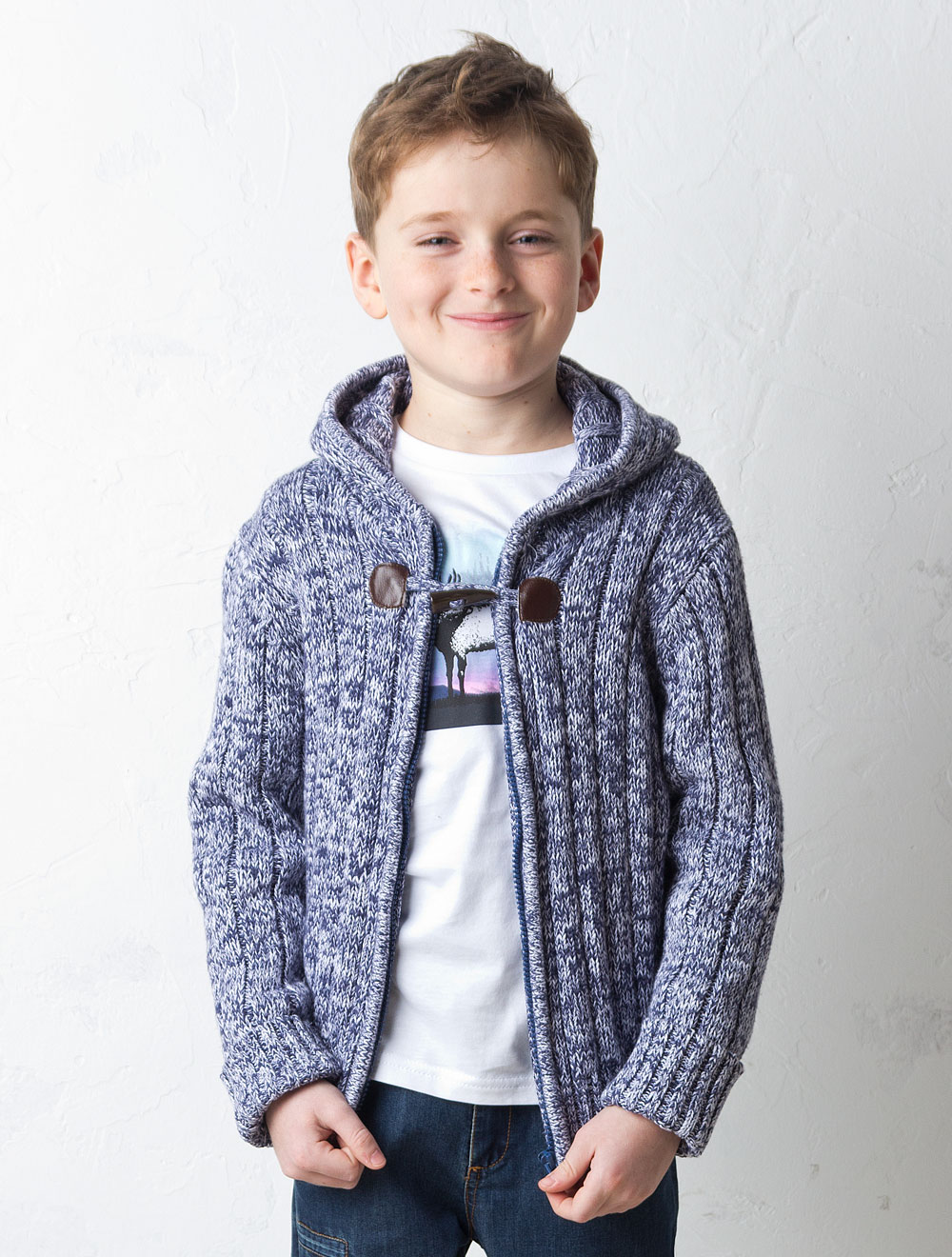 Описание: Вязаный жакет с декоративной застежкой и капюшоном.