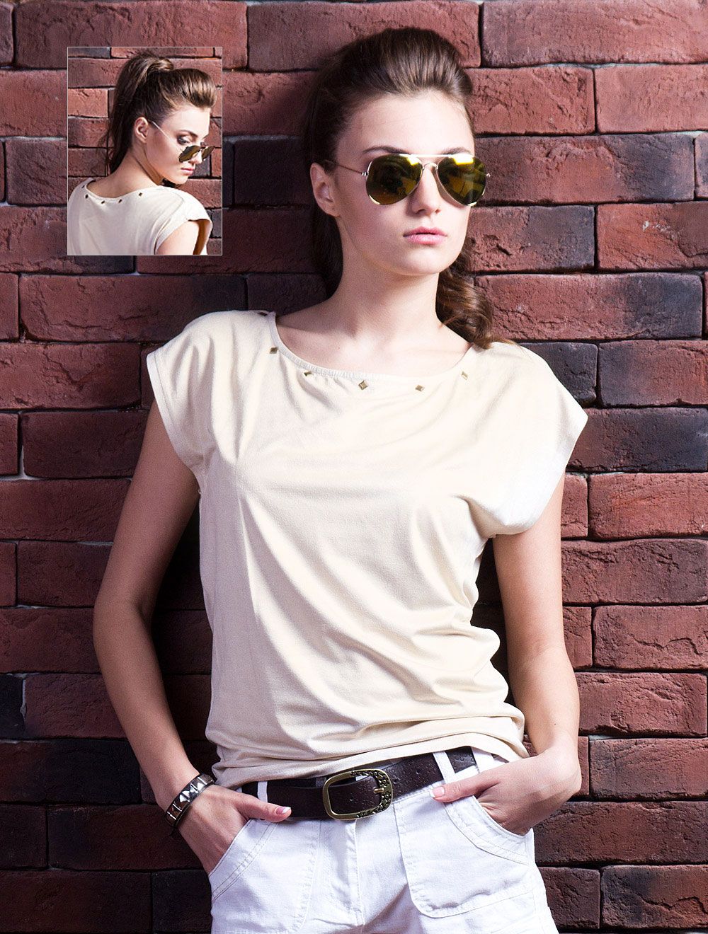 Описание: Спинка выполнена из тонкого вискозного трикотажа, перед из мягкого трикотажного полотна с имитацией под иск.замшу, горловина украшена заклепками квадратной формы цвета состаренного золота.