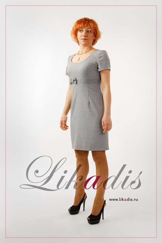 Описание: Платье торговой марки "LIKADIS" прямого приталенного силуэта. Короткий рукав. Застегивается на молнию сзади. Под грудью атласная чёрная ткань и украшение - бантик.