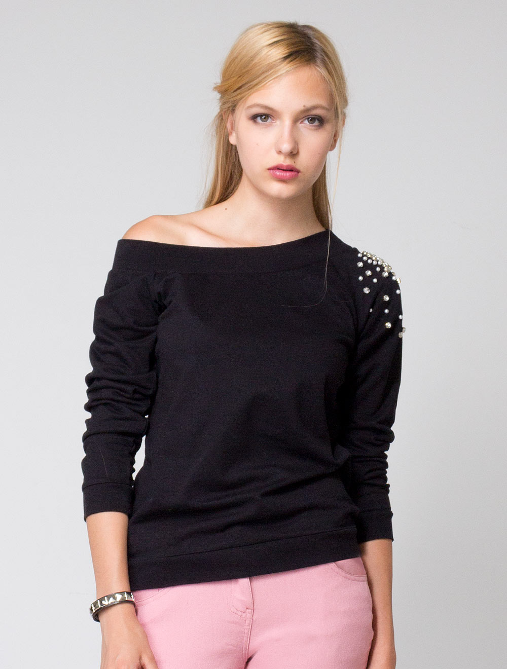 Описание: "Толстовочный" хлопковый трикотаж небольшой плотности.Ассиметричный крой горловины, предполагает носку с одним открытым плечом. Второе плечо с рукавом реглан, украшено миксом из крупных кристаллов и жемчужин.