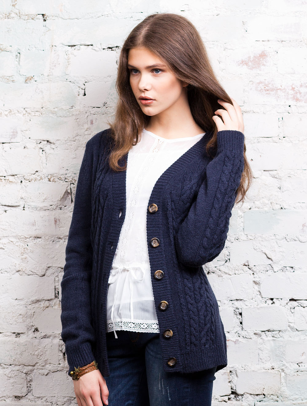 Описание: Плотная вязка узором "косы", контрастные пуговицы, пояс на талии