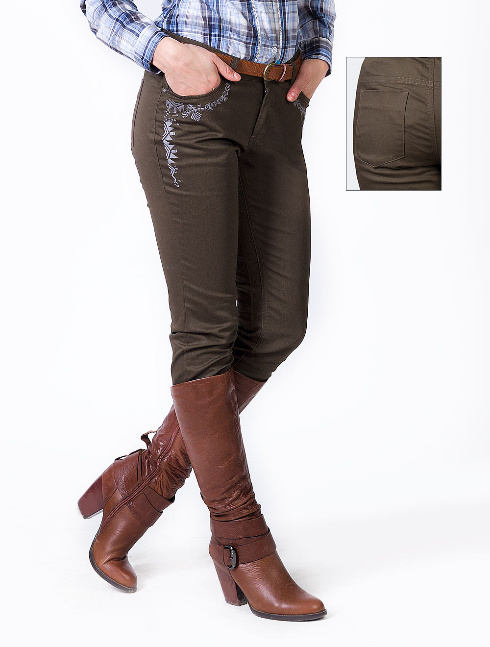 Описание: Плотный эластичный хлопок, джинсовая конструкция, под карманами спереди симметрично расположена вышивка в этническом стиле