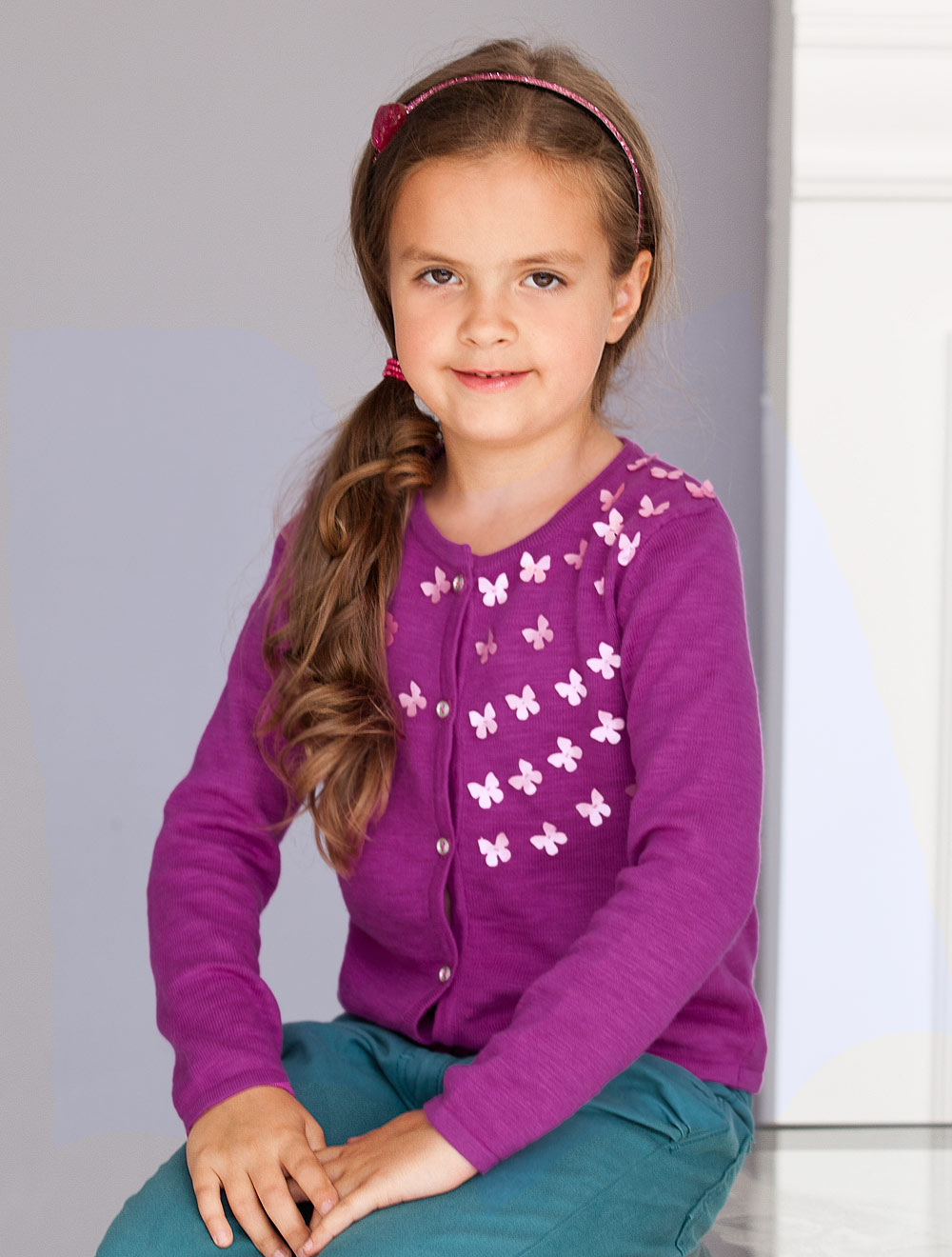 Описание: Жакет из мягкой хлопковой пряжи, декорированный аппликацией в виде бабочек.