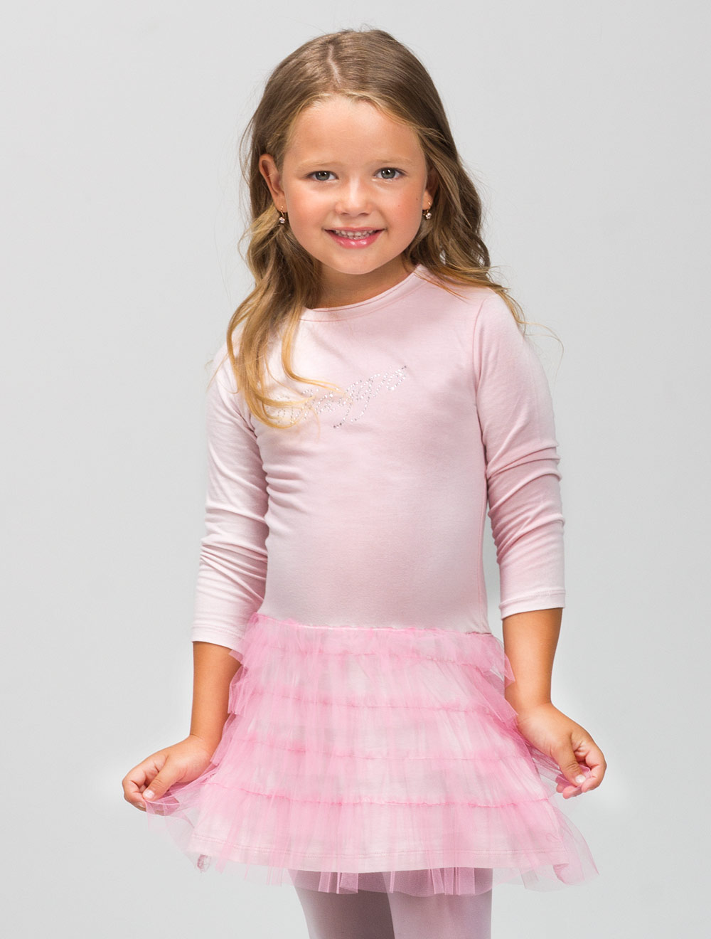 Описание: Платье из трикотажного полотна, декорированное аппликацией из стразов.