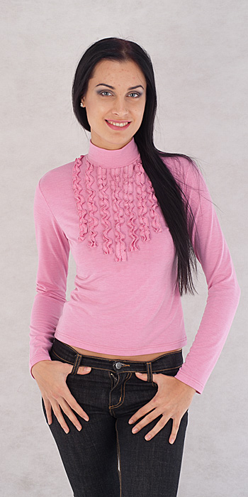Описание модели: Блуза женская из трикотажного полотна прилегающего силуэта с воротником "стойка" и длинным рукавом. По верху переда отделка рюшами. Длина изделия: р. 44-48 около 55 см и р. 50 около 57 см