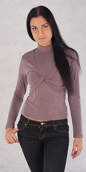 Описание модели: Блуза женская из трикотажного полотна прилегающего силуэта с длинным рукавом и воротником "стойка". Изделие с имитацией "болеро" (ложная двойка) с перекрутом посередине. Длина изделия р.44-48 около 52 см и р. 50 около 60 см.