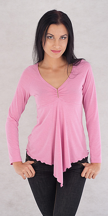 Описание модели: Блуза женская из трикотажного полотна полуприлегающего силуэта с V-образным вырезом горловины и длинным рукавом покроя "реглан". Блуза отрезная под грудью с фигурным низом. Верх переда украшен стразами. Длина изделия: р. 44-48 около 55 см и р. 50 около 60 см